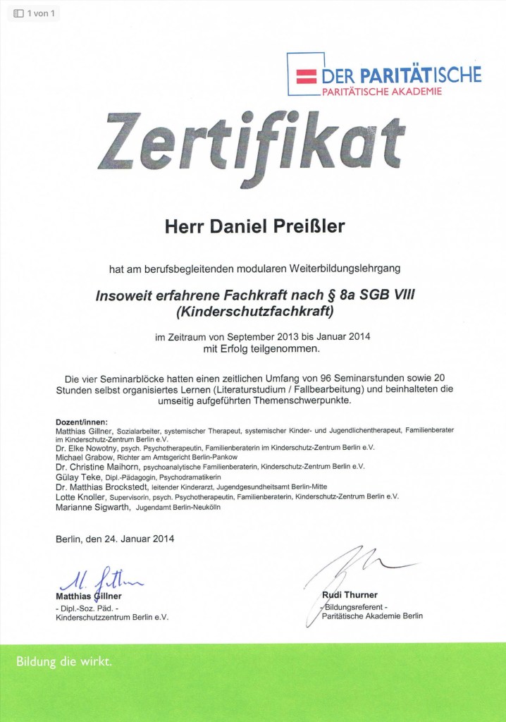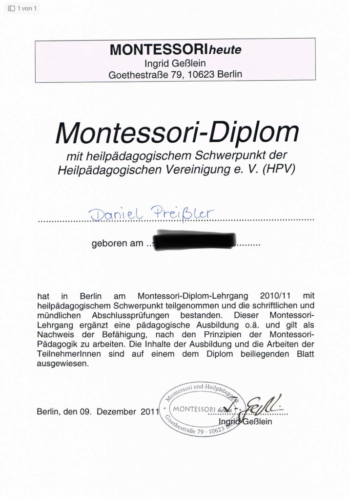 In den folgenden Jahren baute ich in Berlin zwei Kinderhäuser zu Montessori-Kinderhäusern um, qualifizierte mich als Leitungsfachkraft und bildete mich beim paritätischen Wolhfahrtsverband zur Insoweit erfahrenen Fachkraft nach § 8a SGB VIII fort.